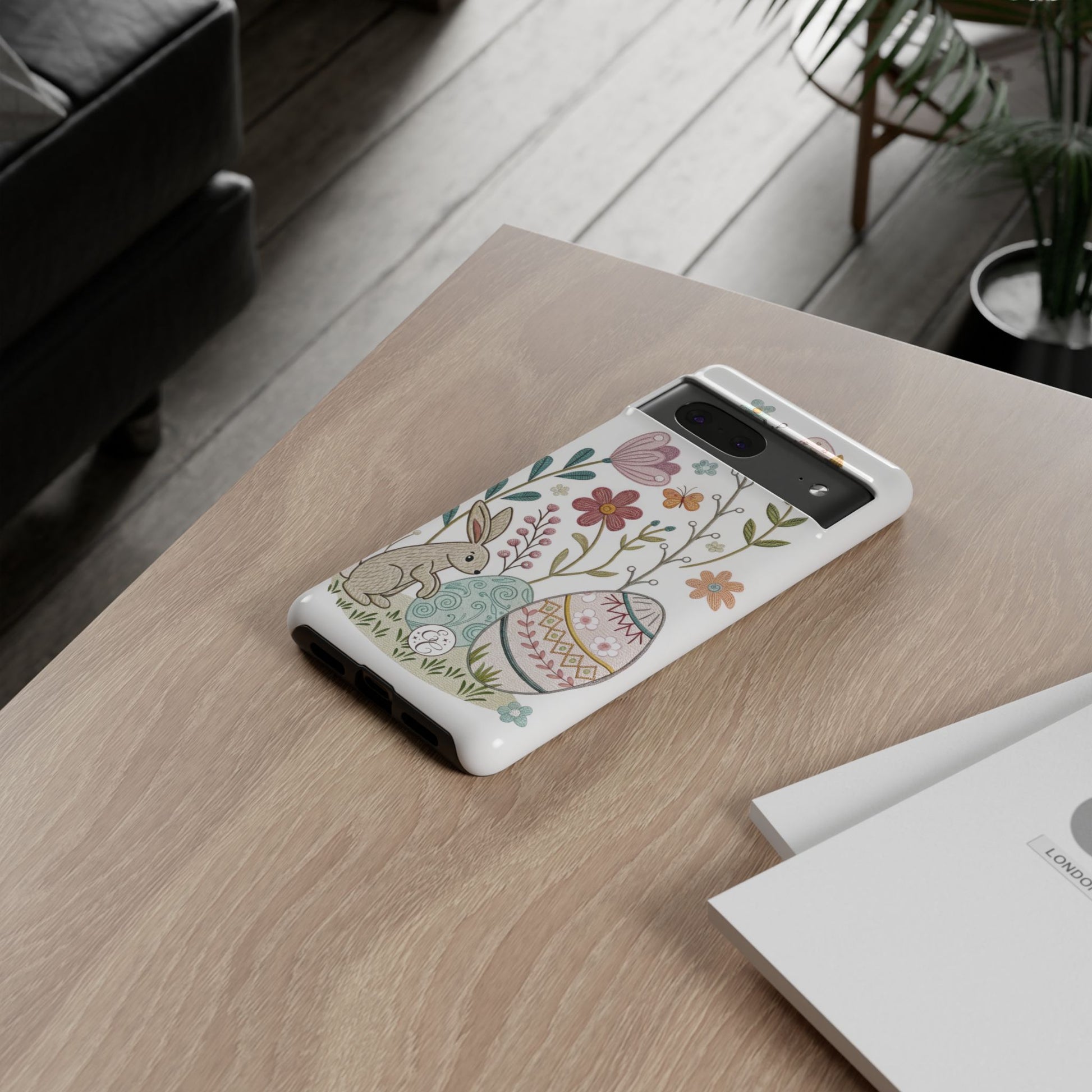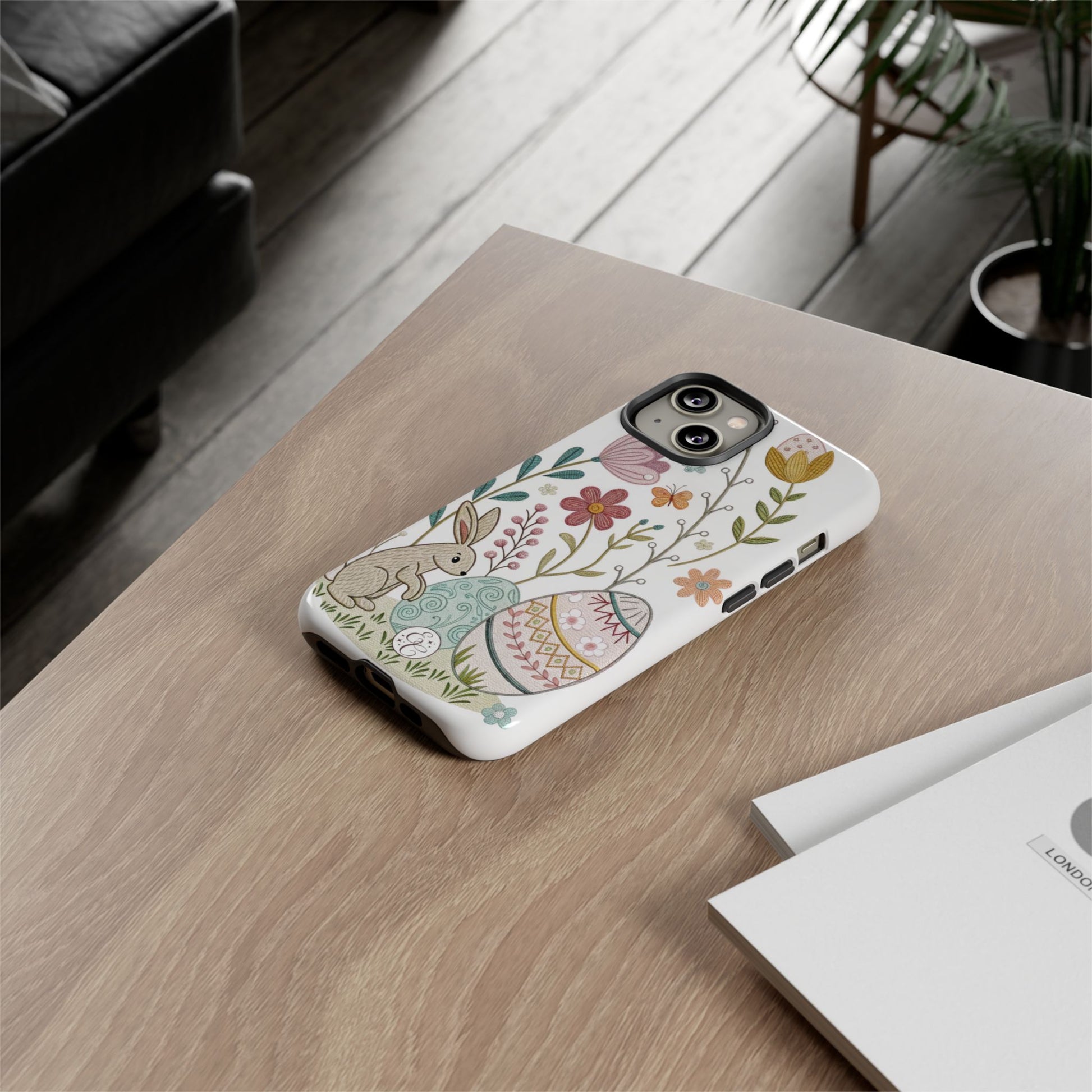 This delightful design features an adorable rabbit sitting beside beautifully decorated Easter eggs and surrounded by delicate spring flowers. Inspired by soft cottagecore and embroidered art styles, this phone case combines seasonal charm with everyday protection.