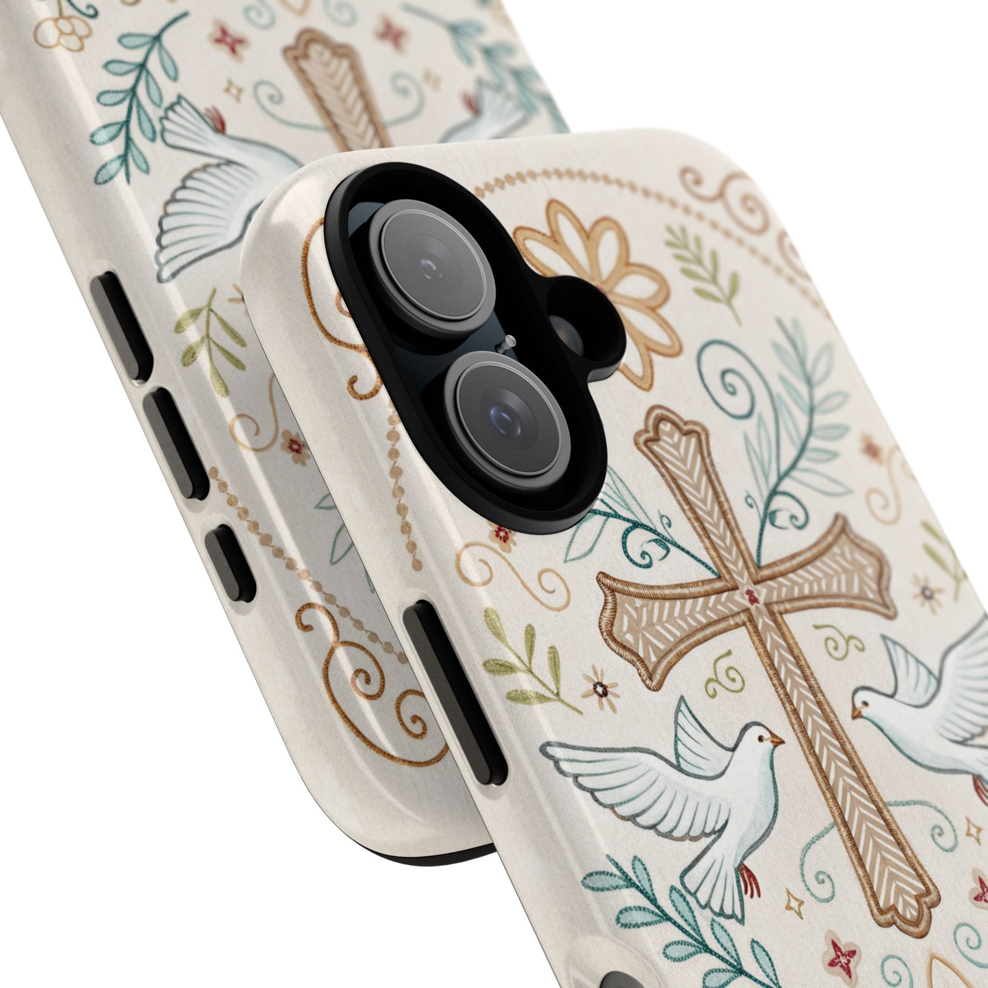 Ideal for anyone searching for a Christian cross phone case, dove iPhone cover, Catholic phone case, religious floral case, or faith-based gift.