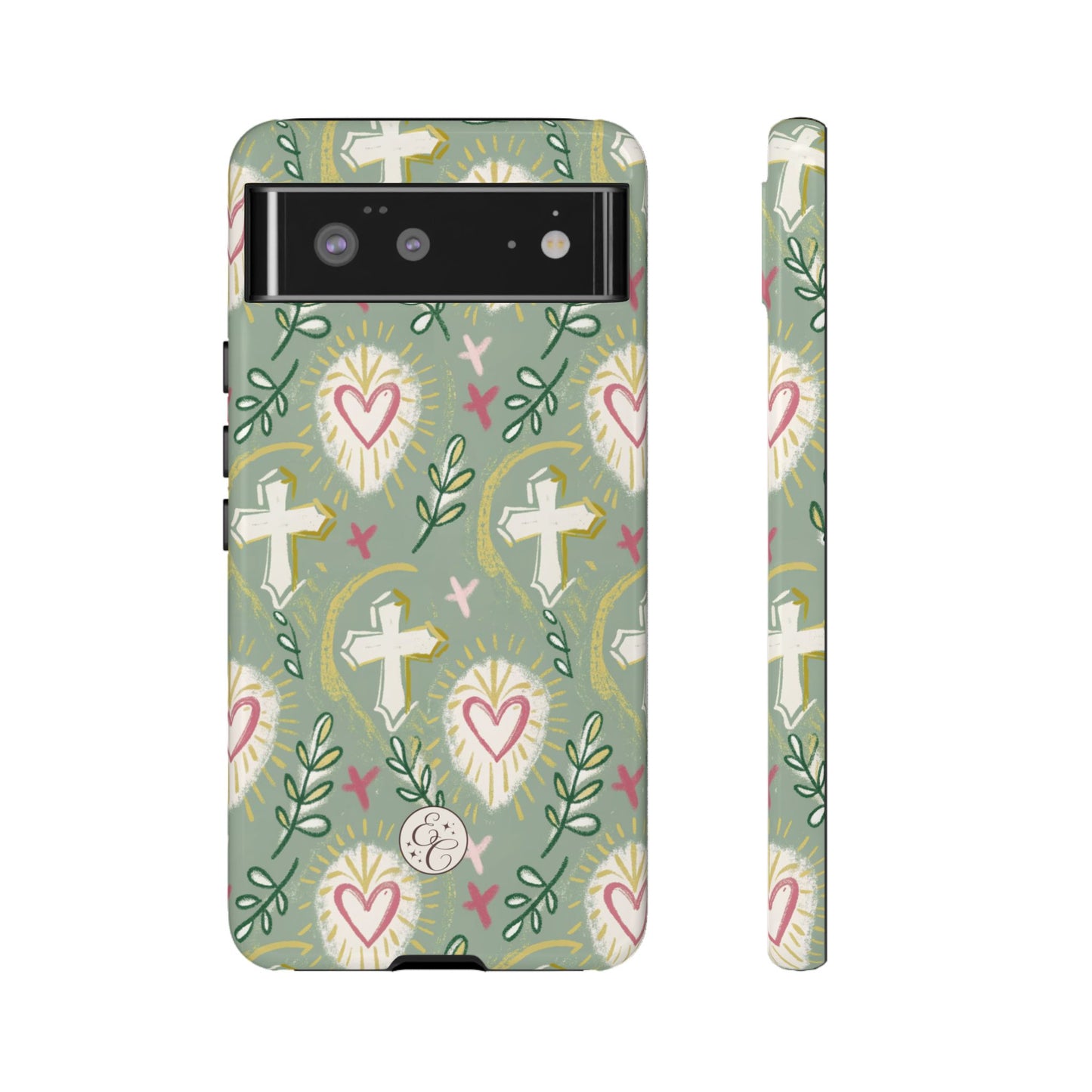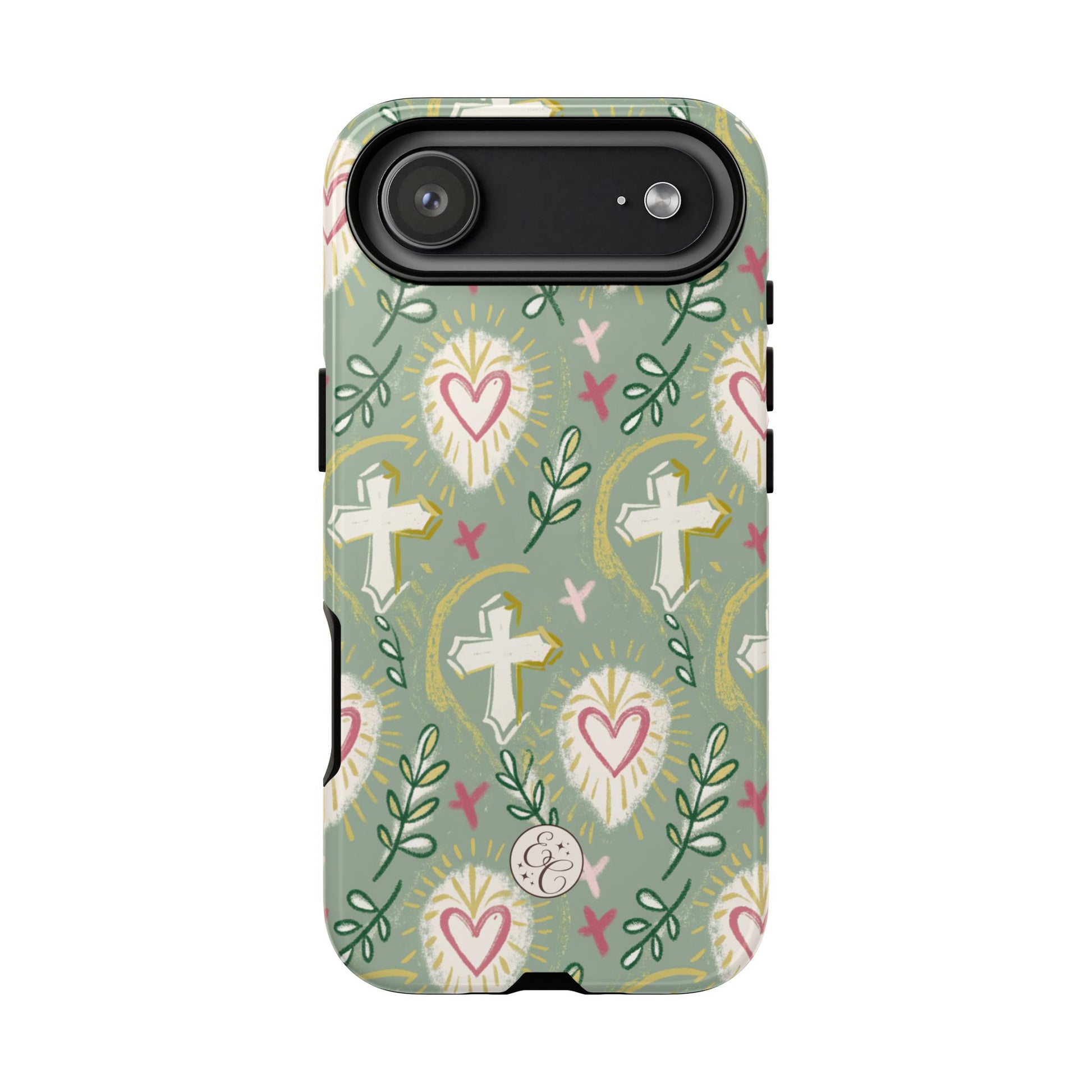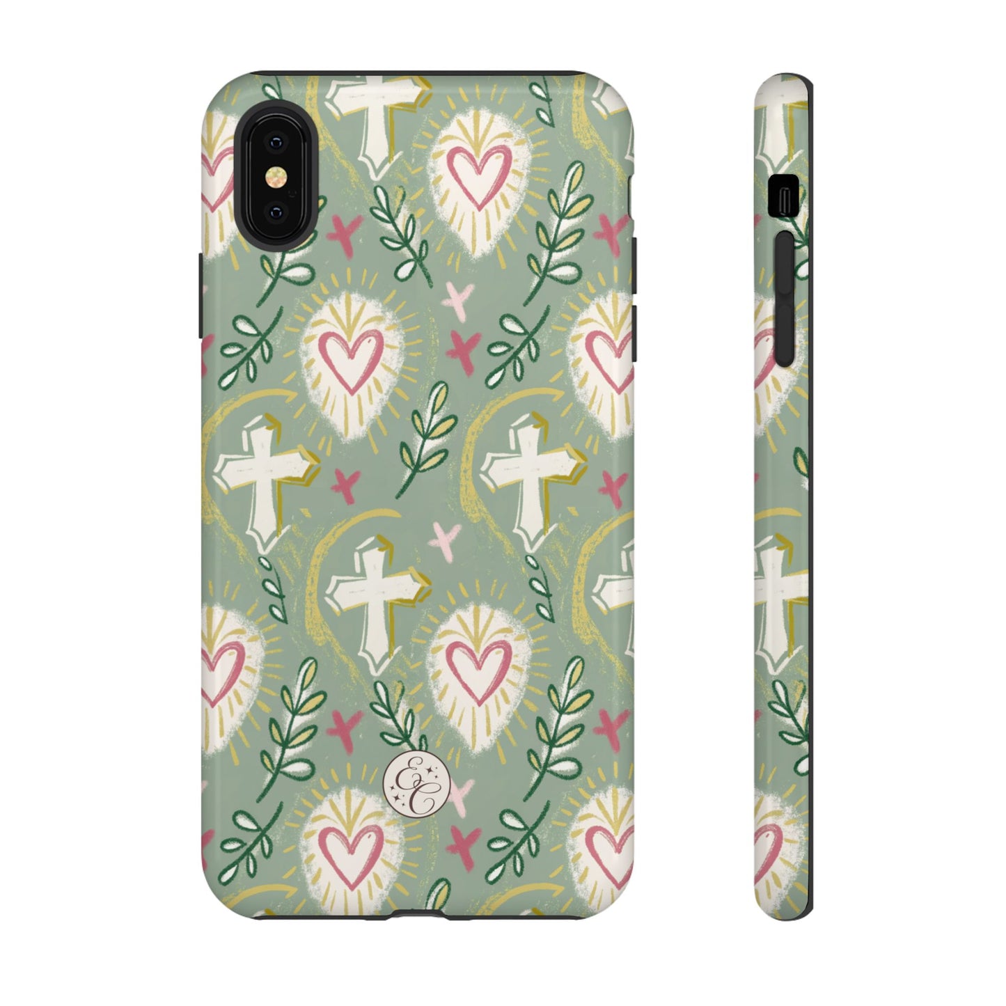 🙏Celebrate faith in style with this beautifully designed phone case featuring a boho-inspired pattern of crosses, sacred hearts ❤️, and olive branches 🌿. The soft pastel tones and hand-drawn elements give it a unique, artistic touch, perfect for those who love religious and spiritual aesthetics 🙏.