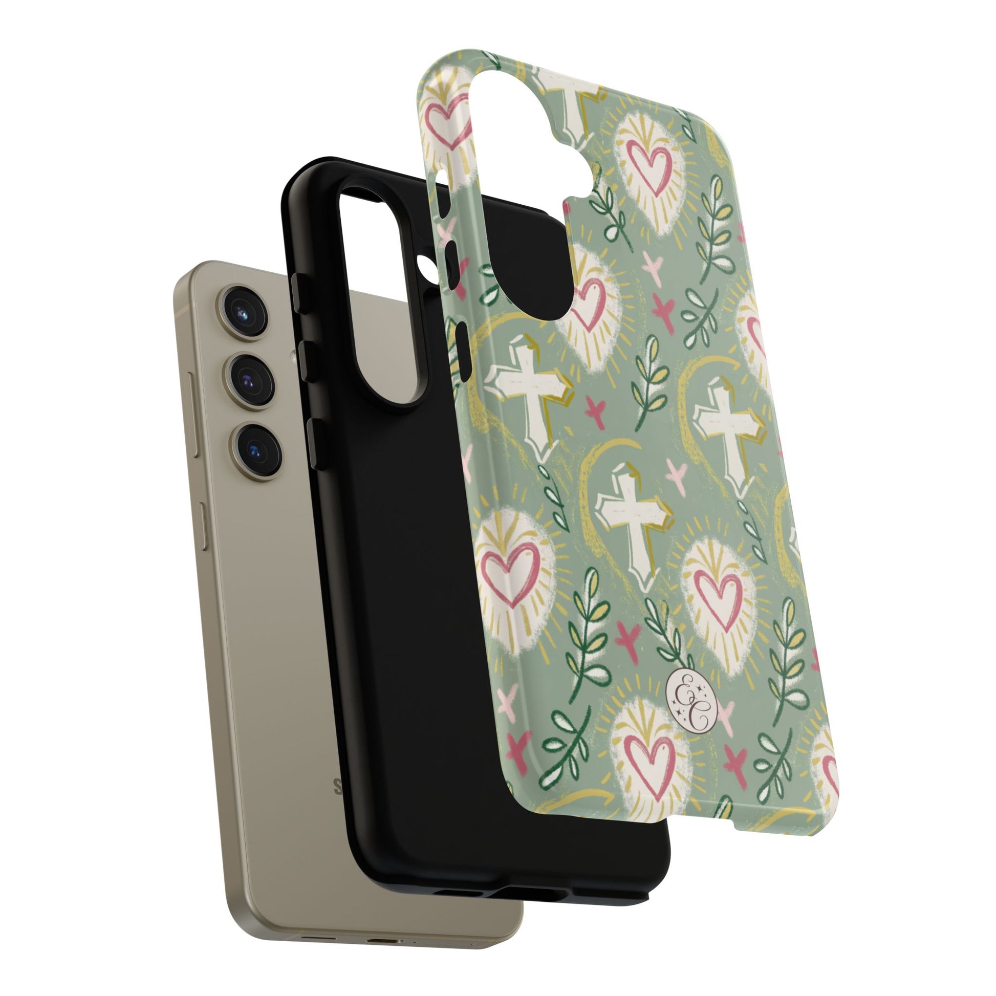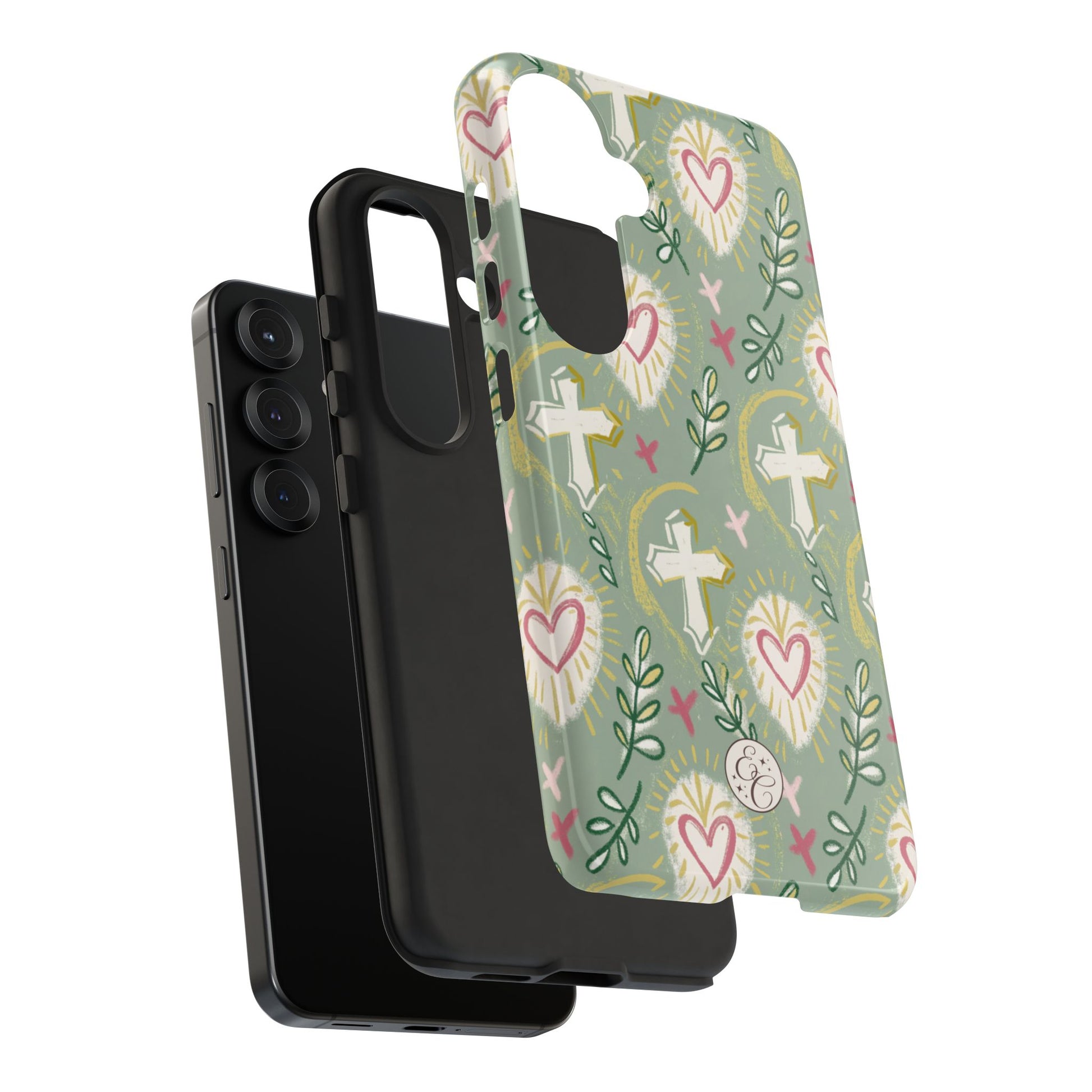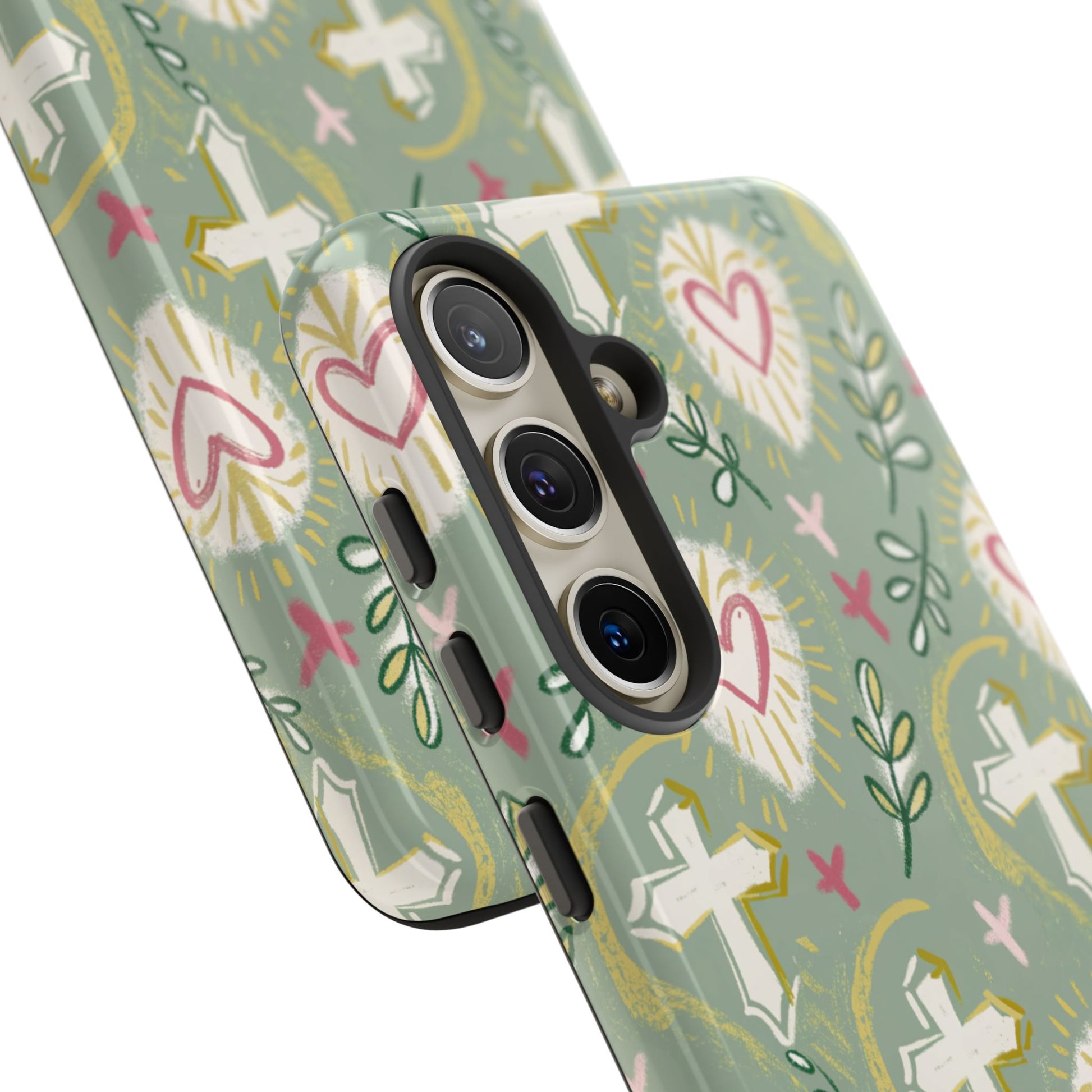 🙏Celebrate faith in style with this beautifully designed phone case featuring a boho-inspired pattern of crosses, sacred hearts ❤️, and olive branches 🌿. The soft pastel tones and hand-drawn elements give it a unique, artistic touch, perfect for those who love religious and spiritual aesthetics 🙏.