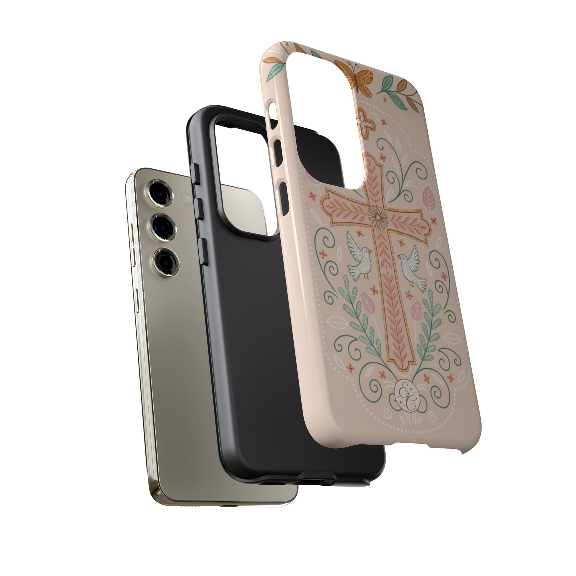 🌼✨Express your faith beautifully with this Easter Cross Tough Phone Case from EnchantCase. Featuring a detailed cross surrounded by delicate floral and nature-inspired elements, this design blends spirituality with a soft, modern aesthetic.