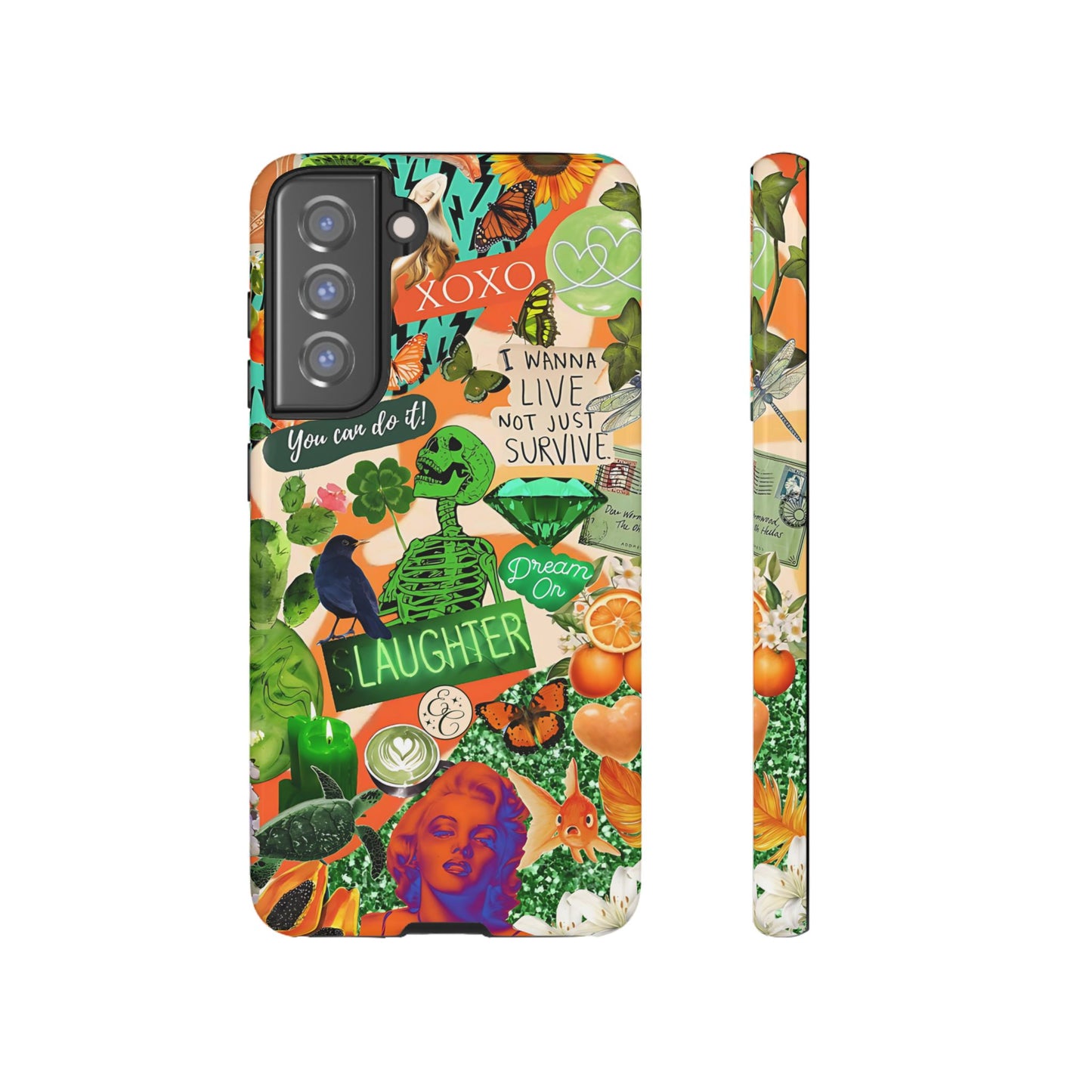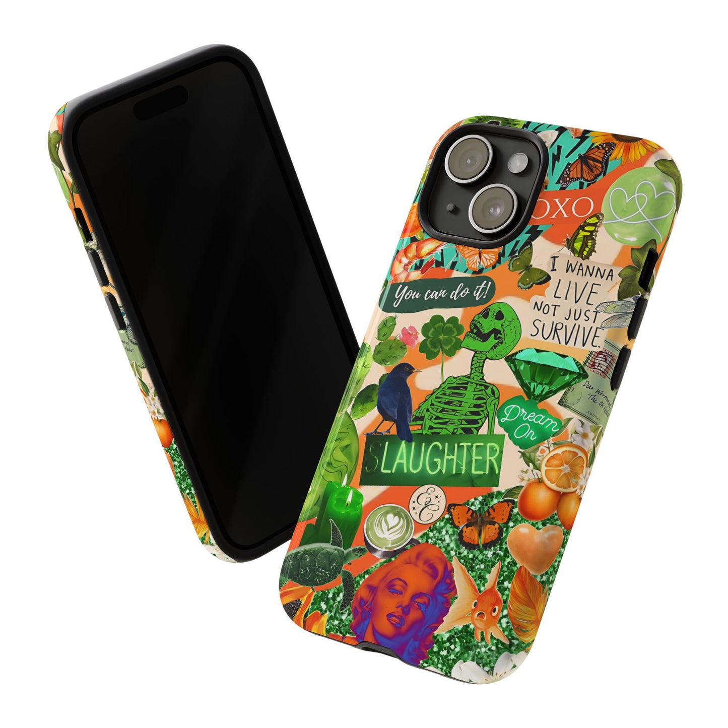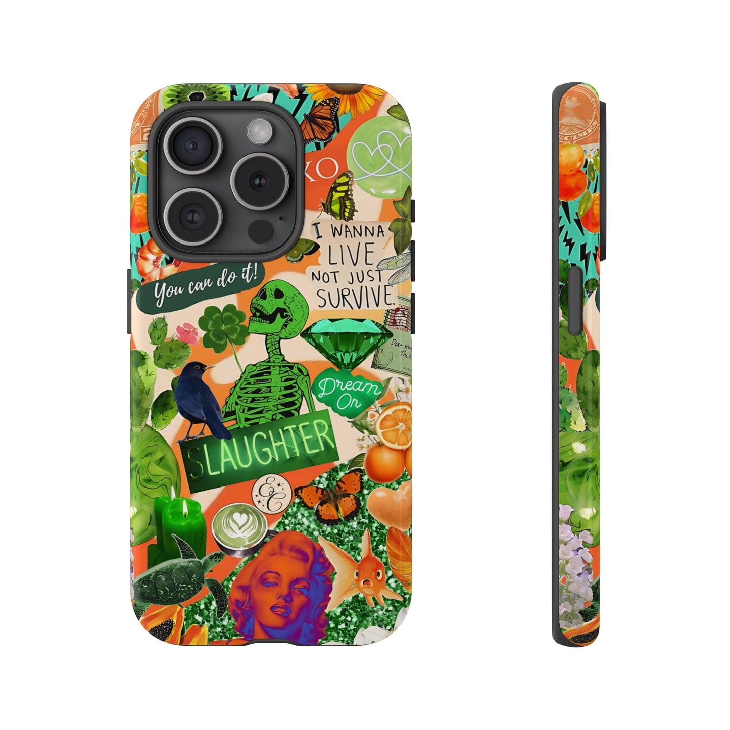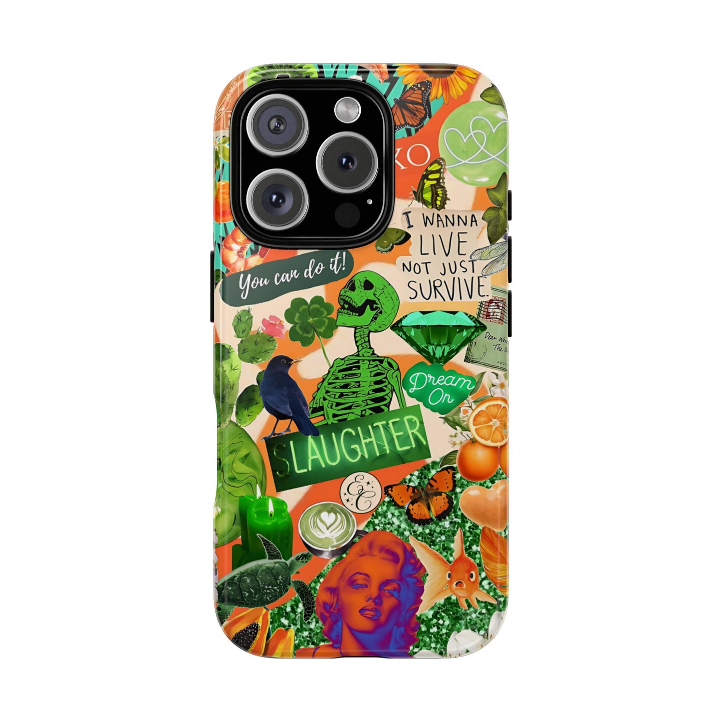 🌿 Express your vibe with this unique motivational collage phone case featuring a funky green skeleton 🌷 Show your style and live with positive energy 📱