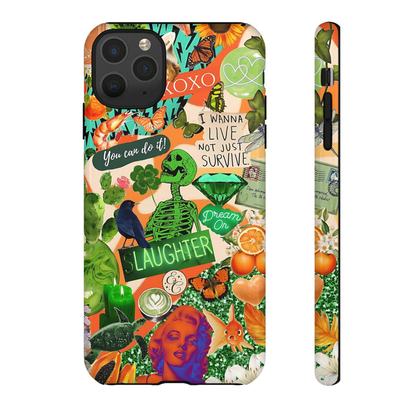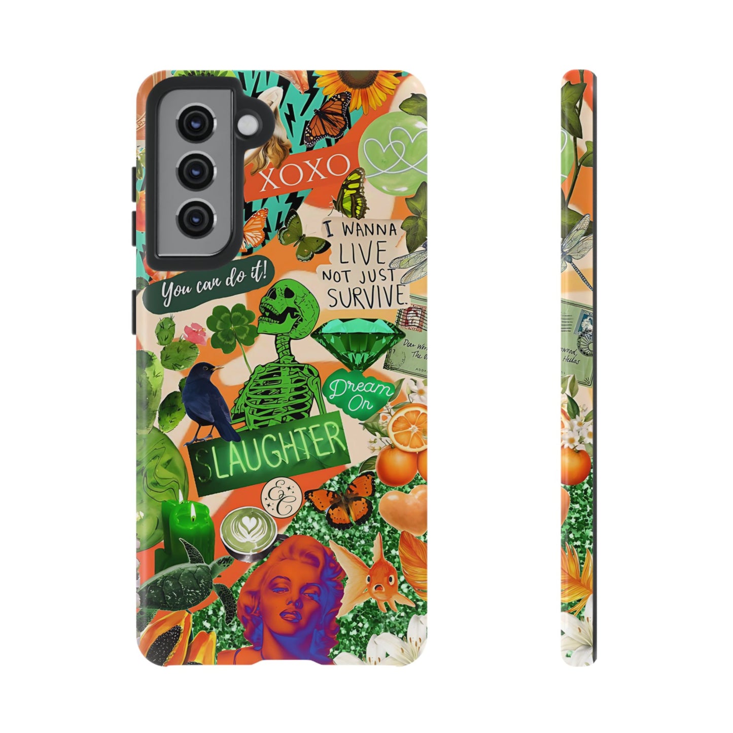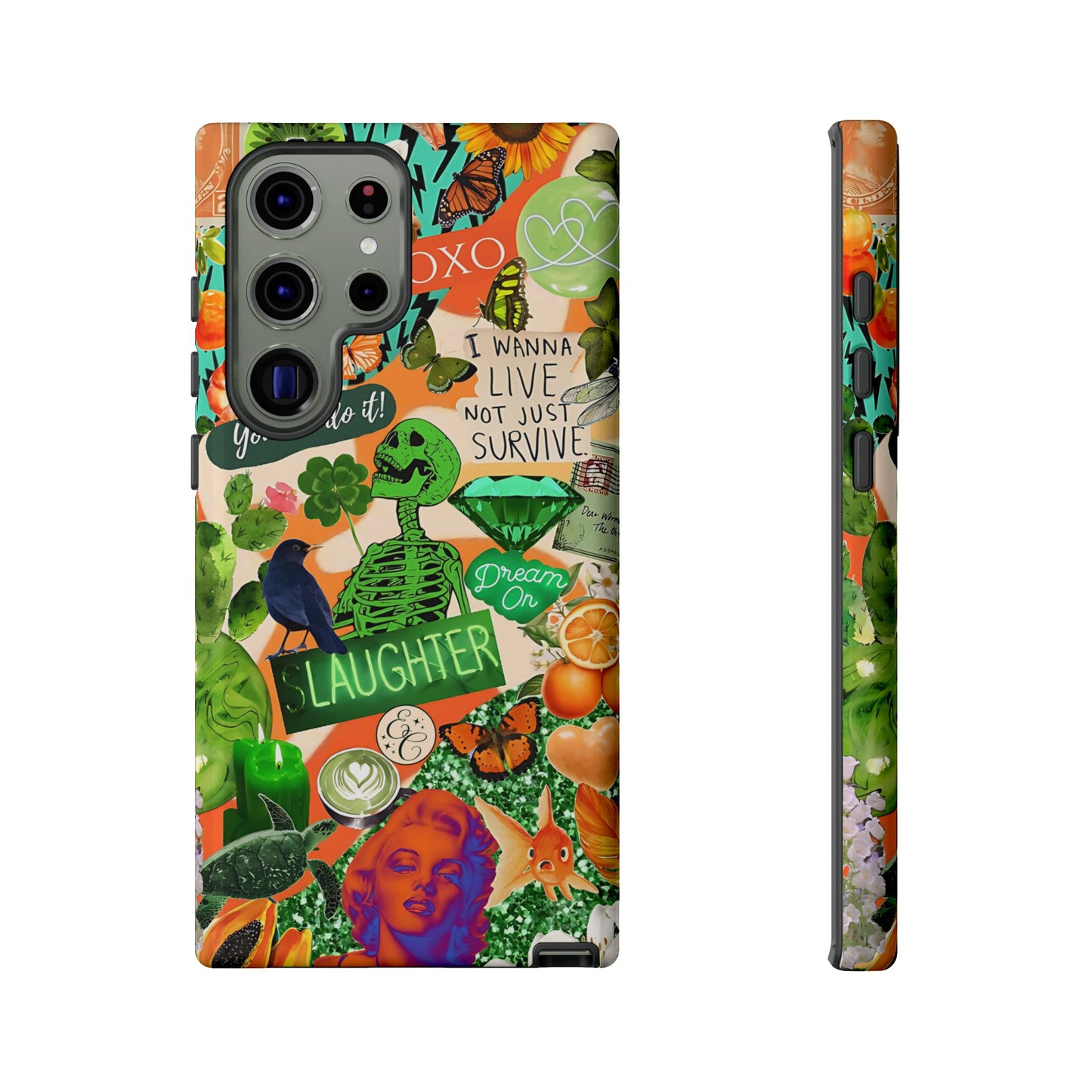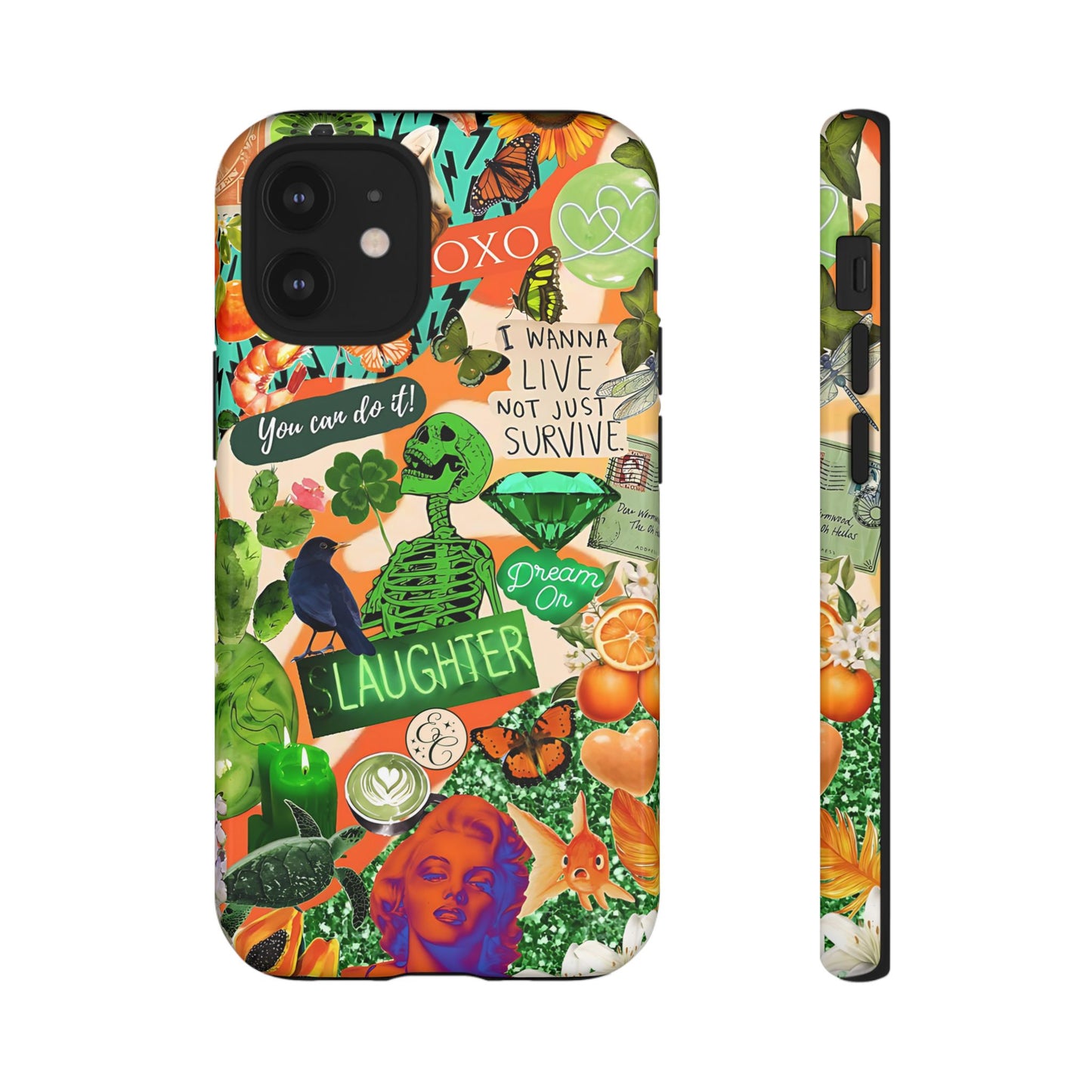 🌿 Express your vibe with this unique motivational collage phone case featuring a funky green skeleton 🌷 Show your style and live with positive energy 📱