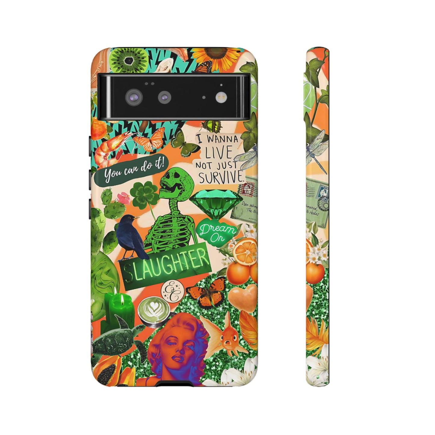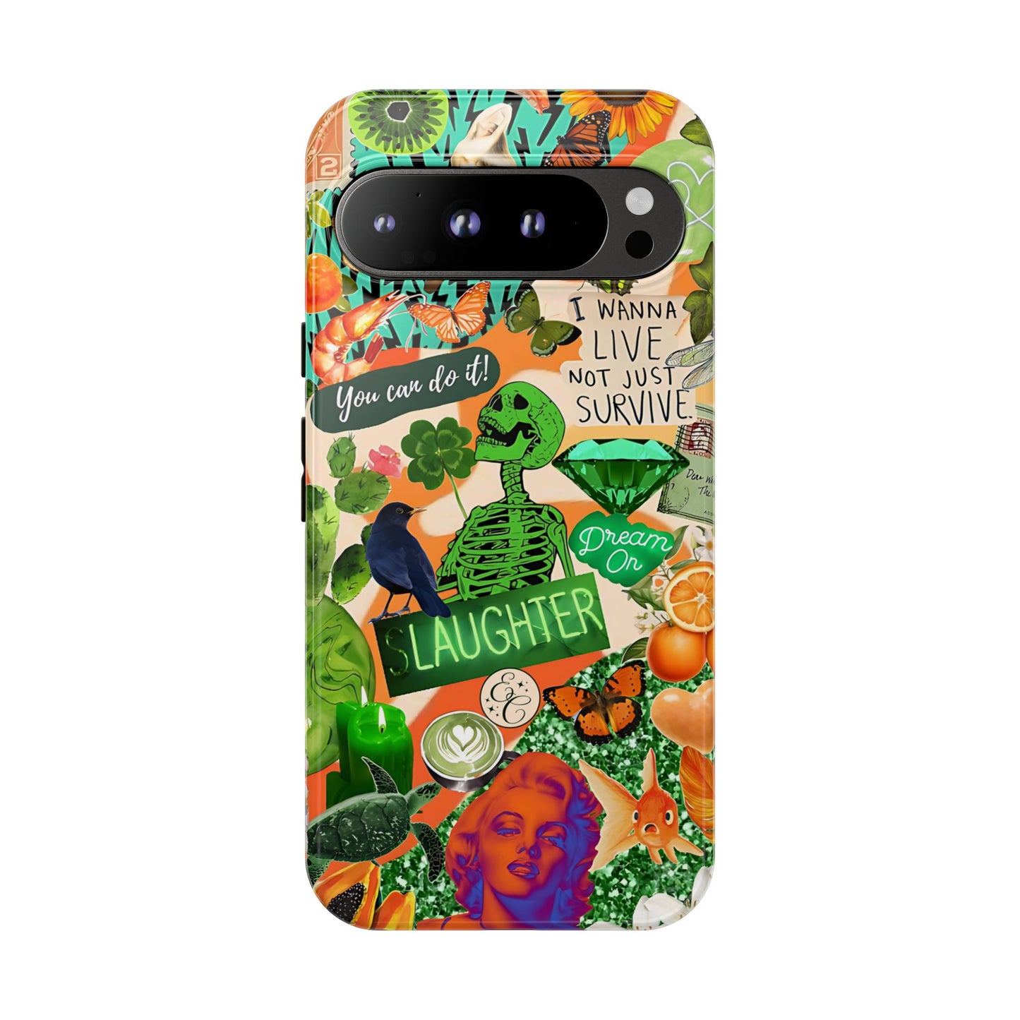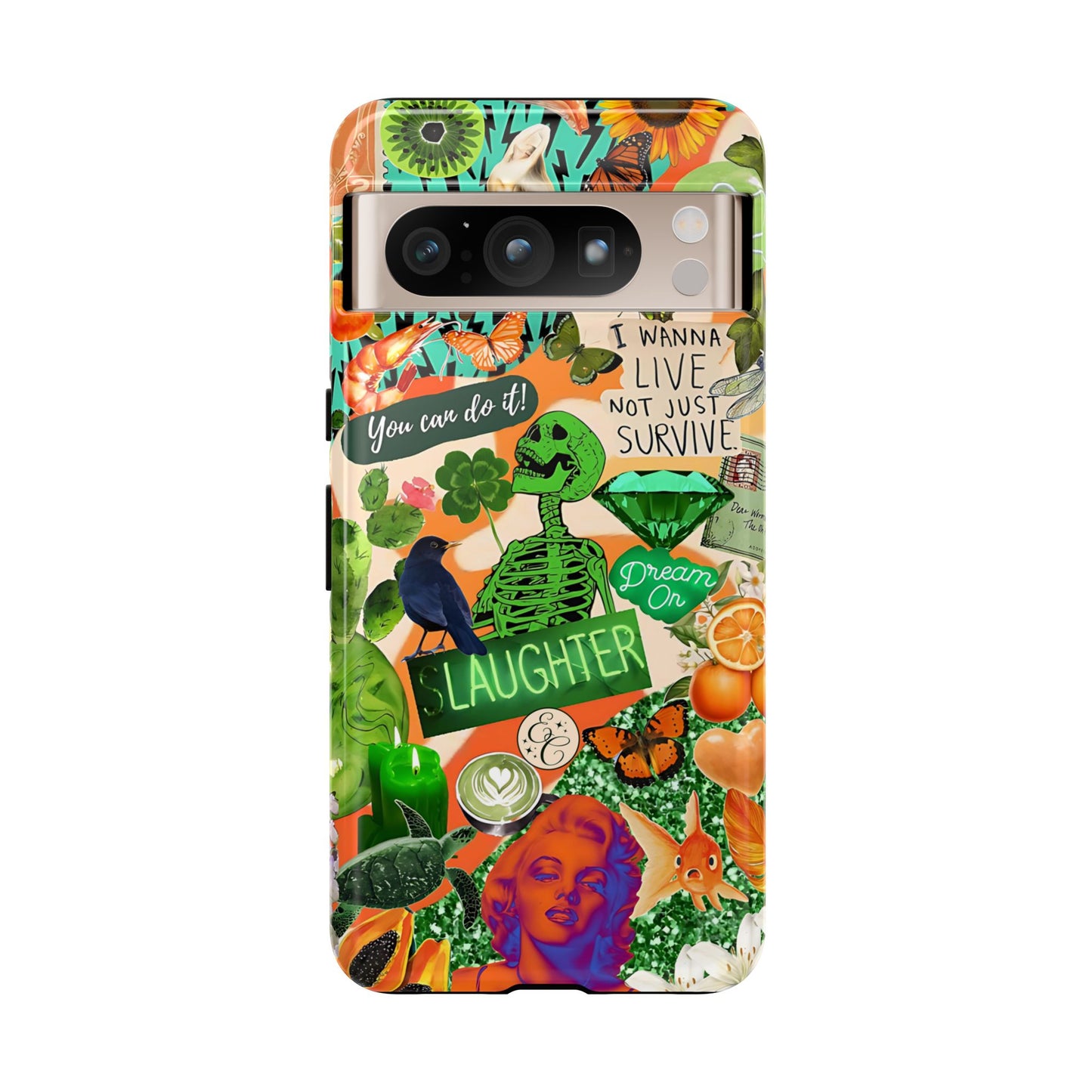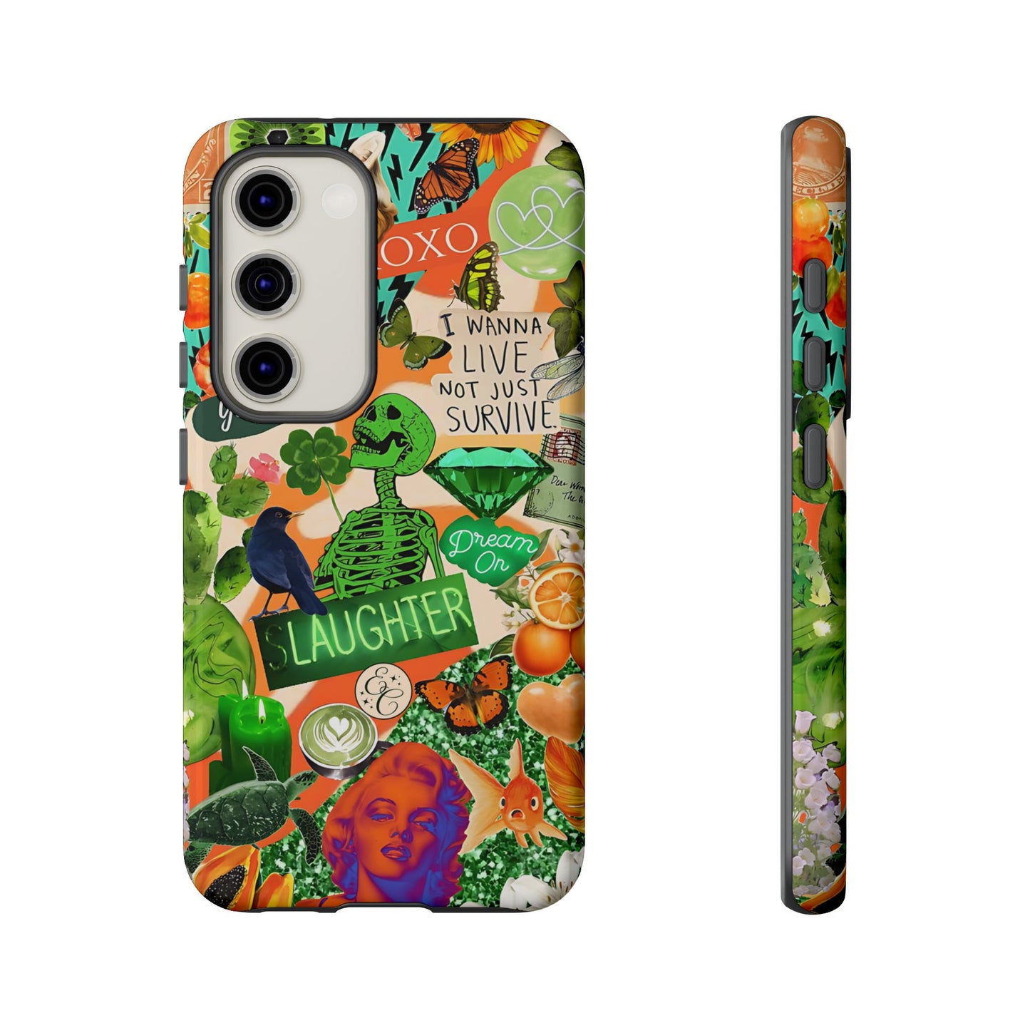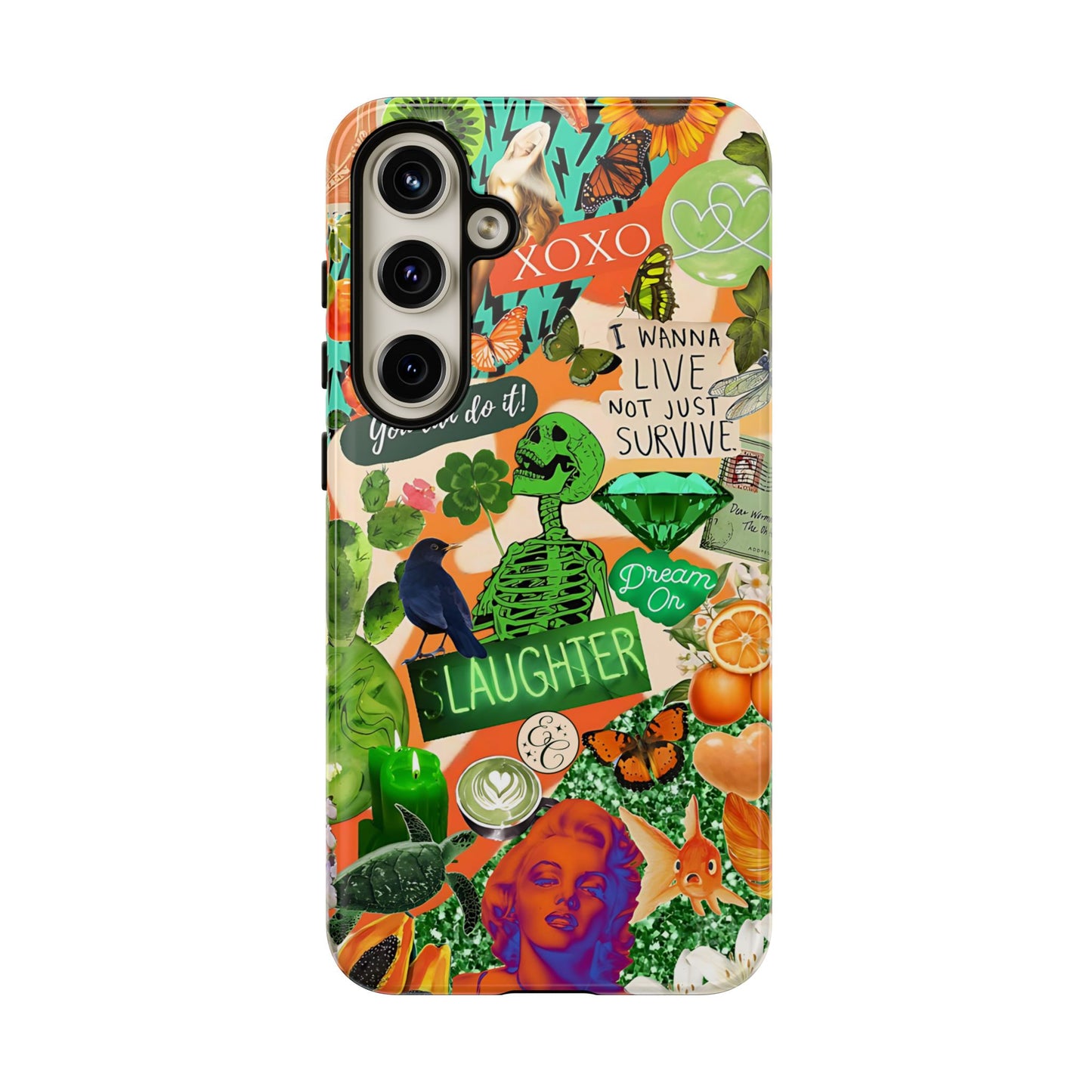 🌿 Express your vibe with this unique motivational collage phone case featuring a funky green skeleton 🌷 Show your style and live with positive energy 📱