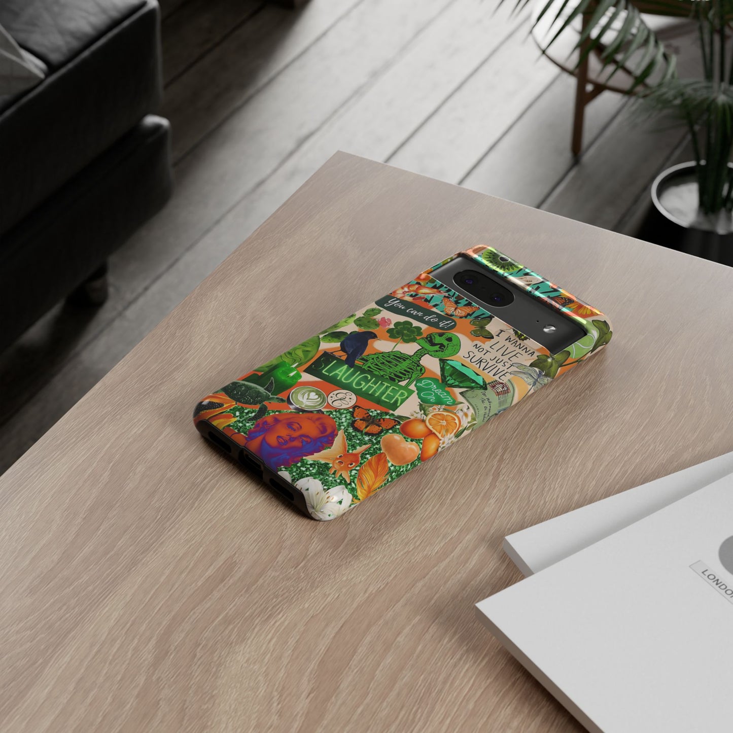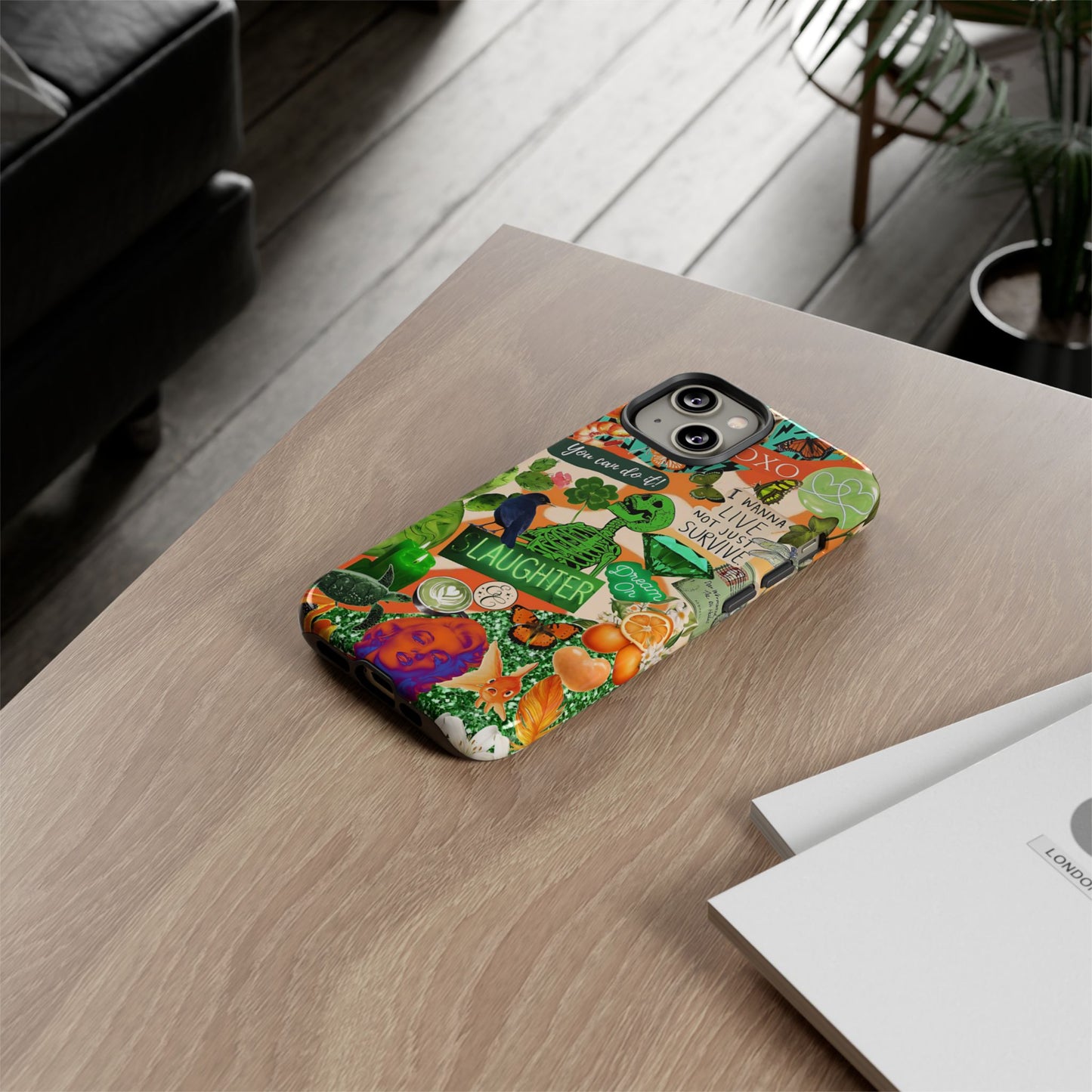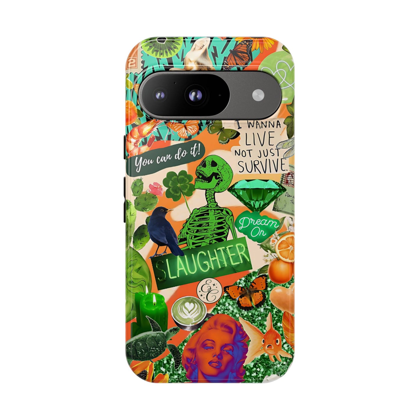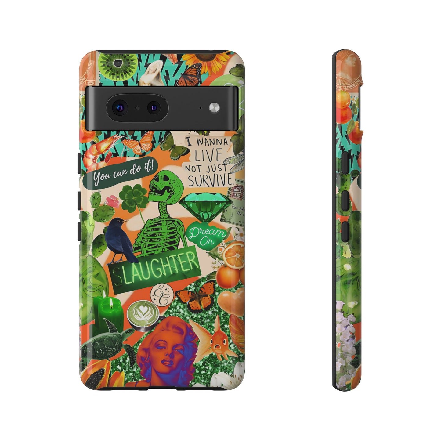 🌿 Express your vibe with this unique motivational collage phone case featuring a funky green skeleton 🌷 Show your style and live with positive energy 📱