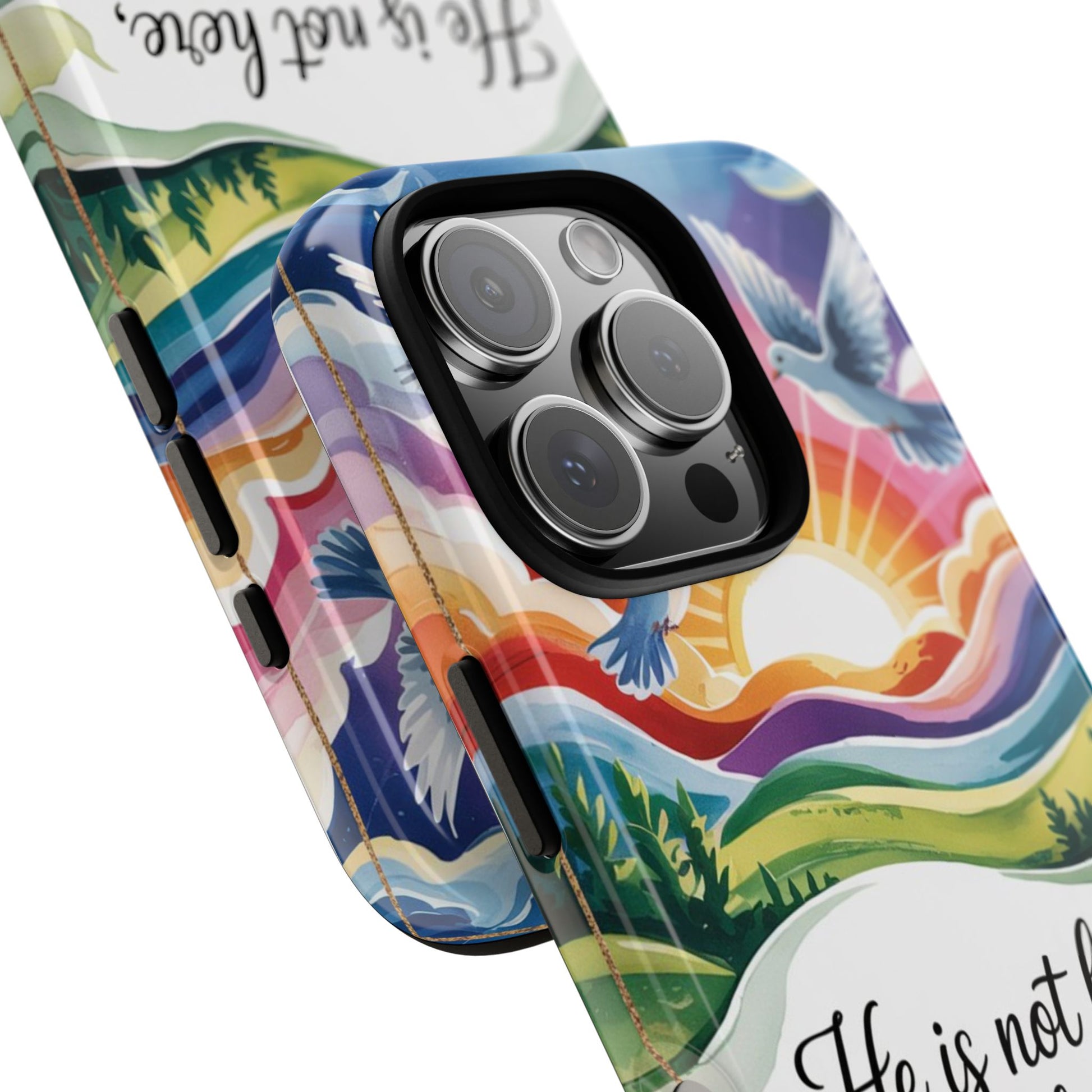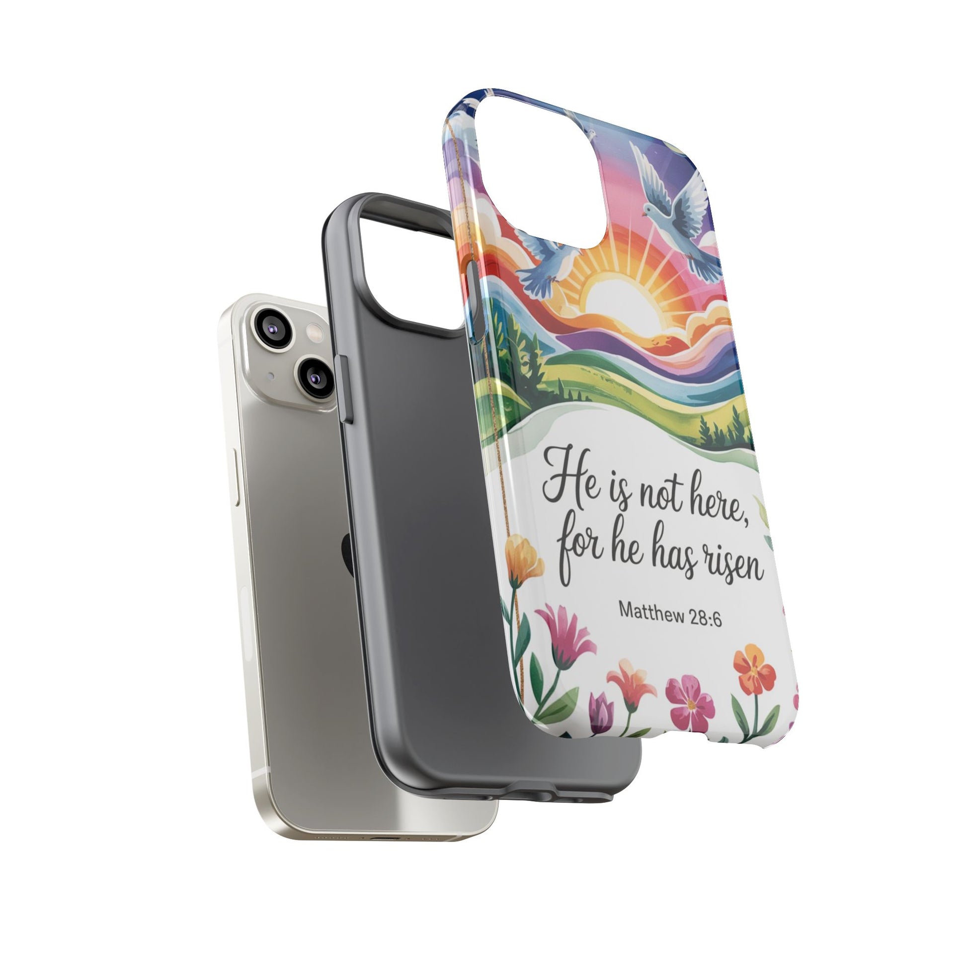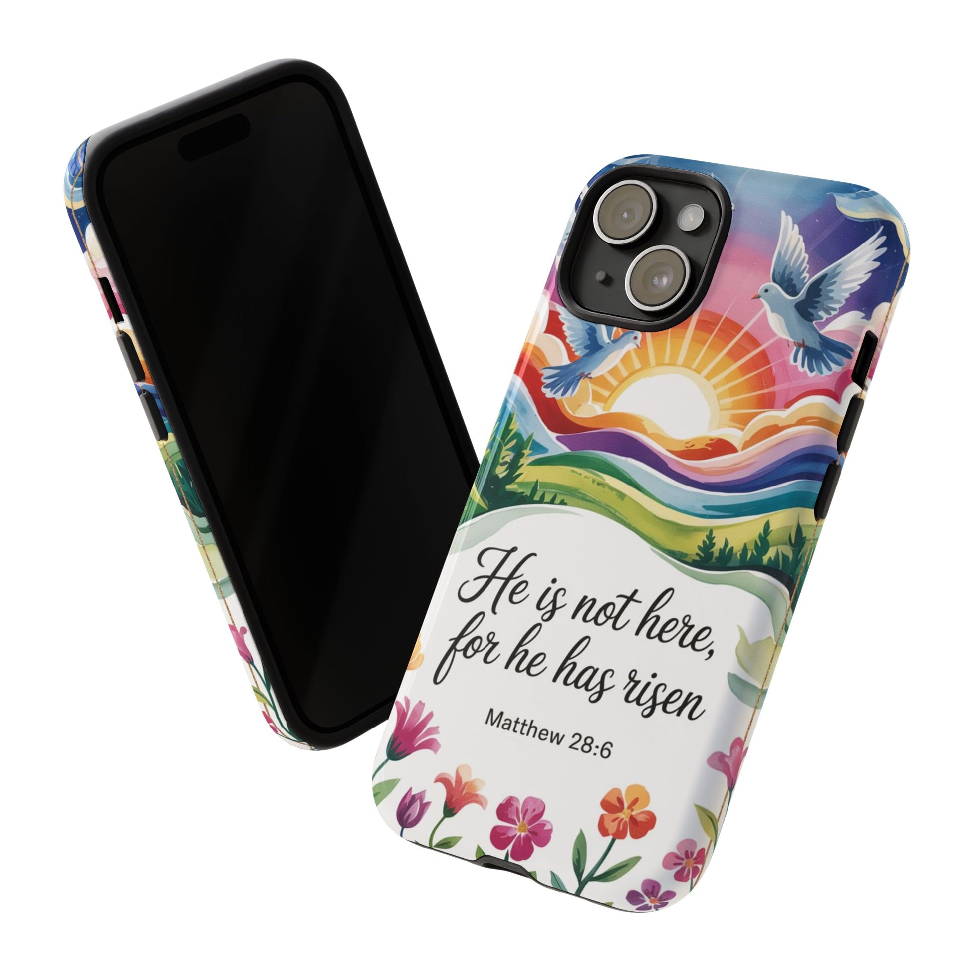 This inspiring design captures the message of hope and resurrection through a beautiful illustration of a radiant sunrise, flying doves, rolling hills, and vibrant flowers. It’s a meaningful faith-inspired phone case perfect for everyday encouragement.
