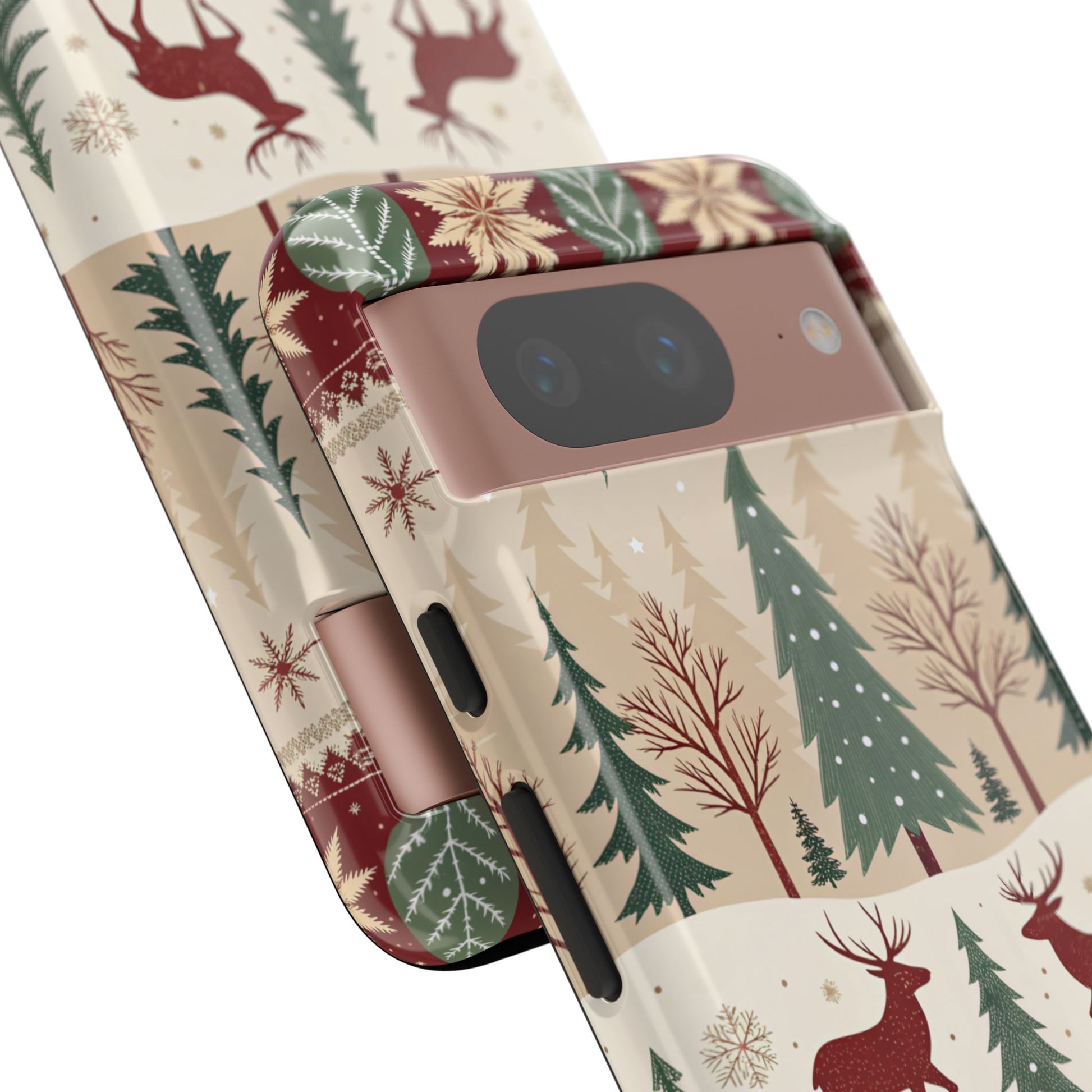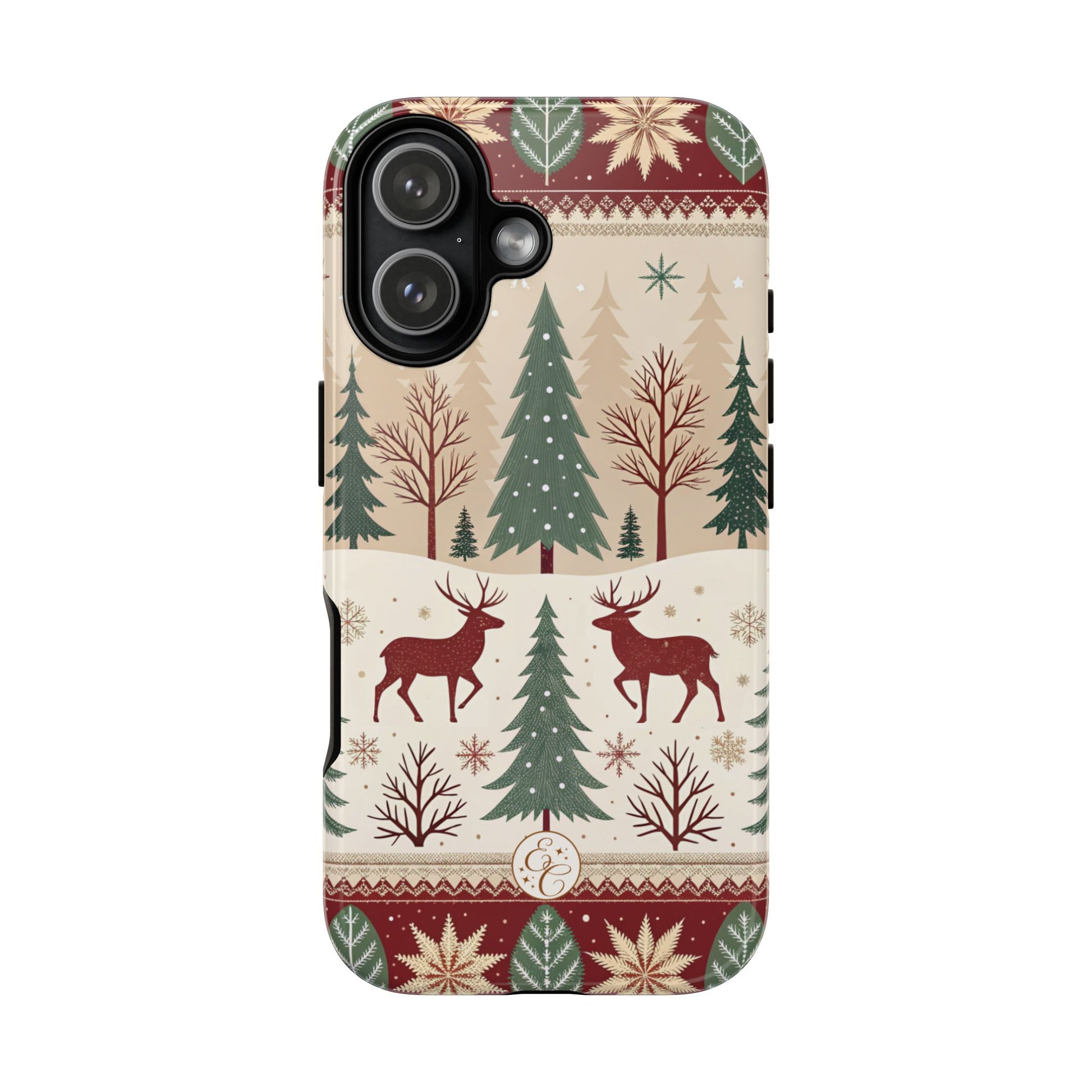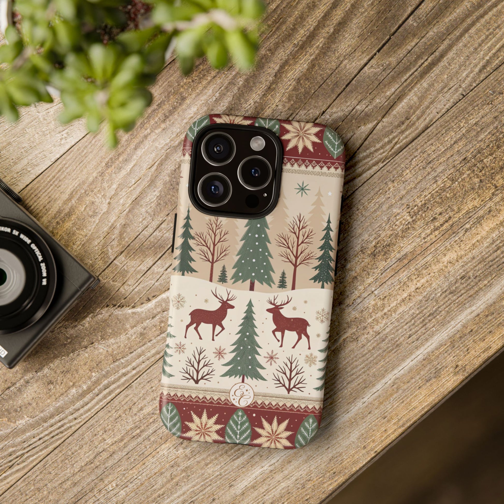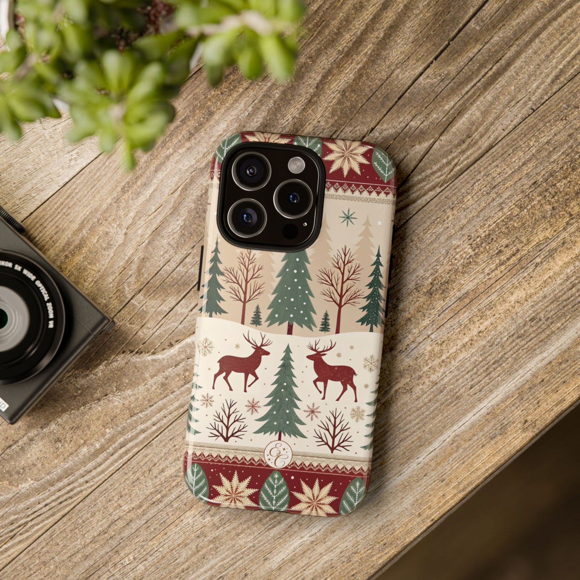 This festive phone case showcases an elegant Nordic-inspired pattern featuring reindeer, snowflakes, and pine trees — perfect for those who love the timeless charm of a classic Christmas aesthetic. ❄️