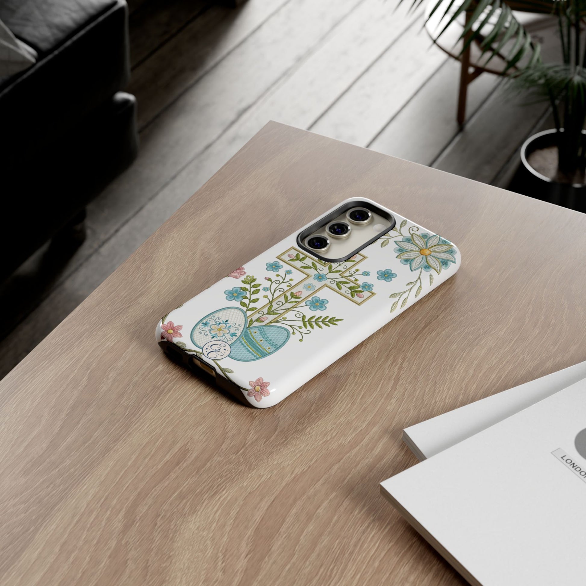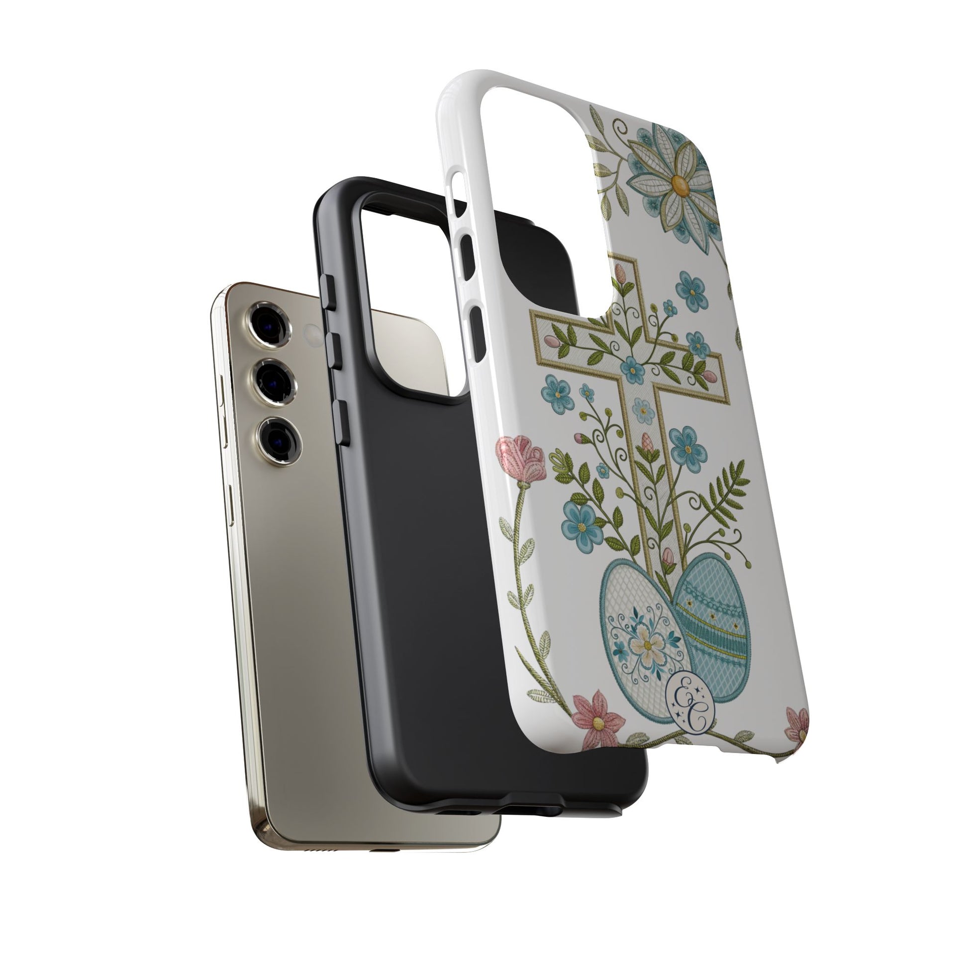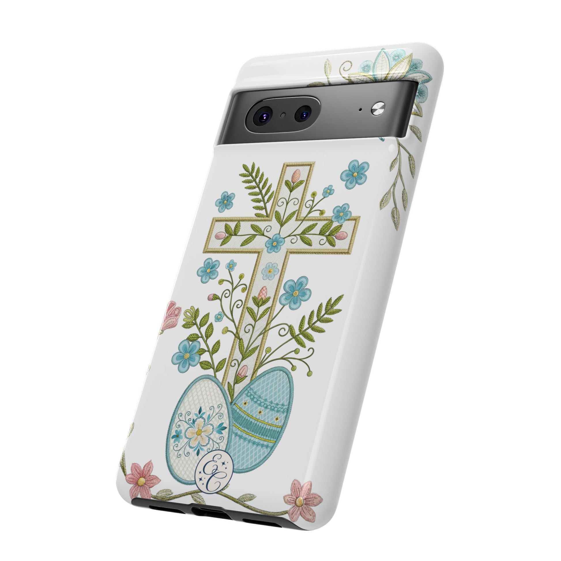 This faith-inspired phone case features a detailed decorative cross adorned with spring flowers and pastel Easter eggs, symbolizing renewal, hope, and resurrection. The soft botanical aesthetic makes it a beautiful seasonal accessory while maintaining a timeless Christian message.